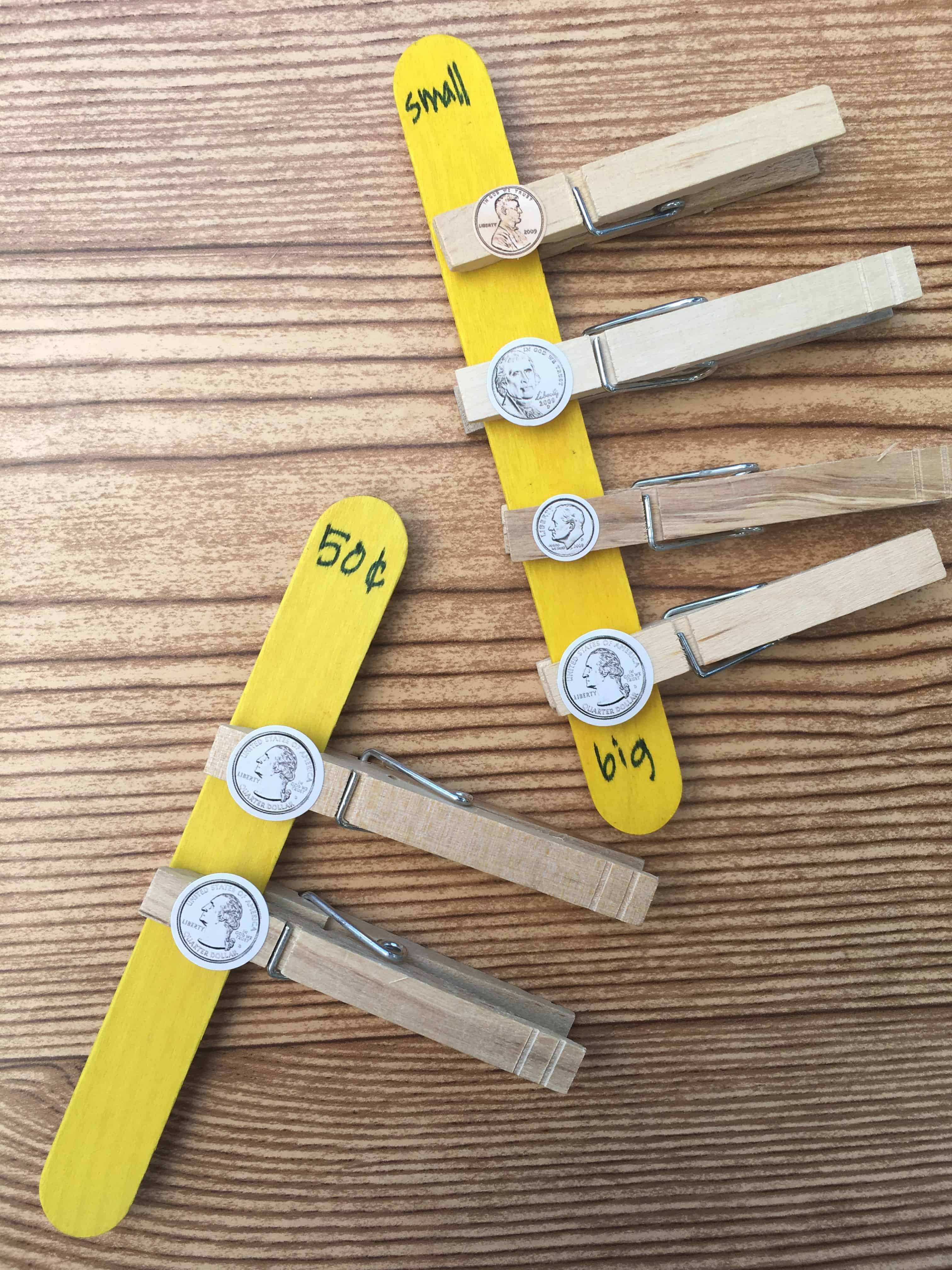 Write on the top of the sticks with different money values (we did the values up to $1.00)