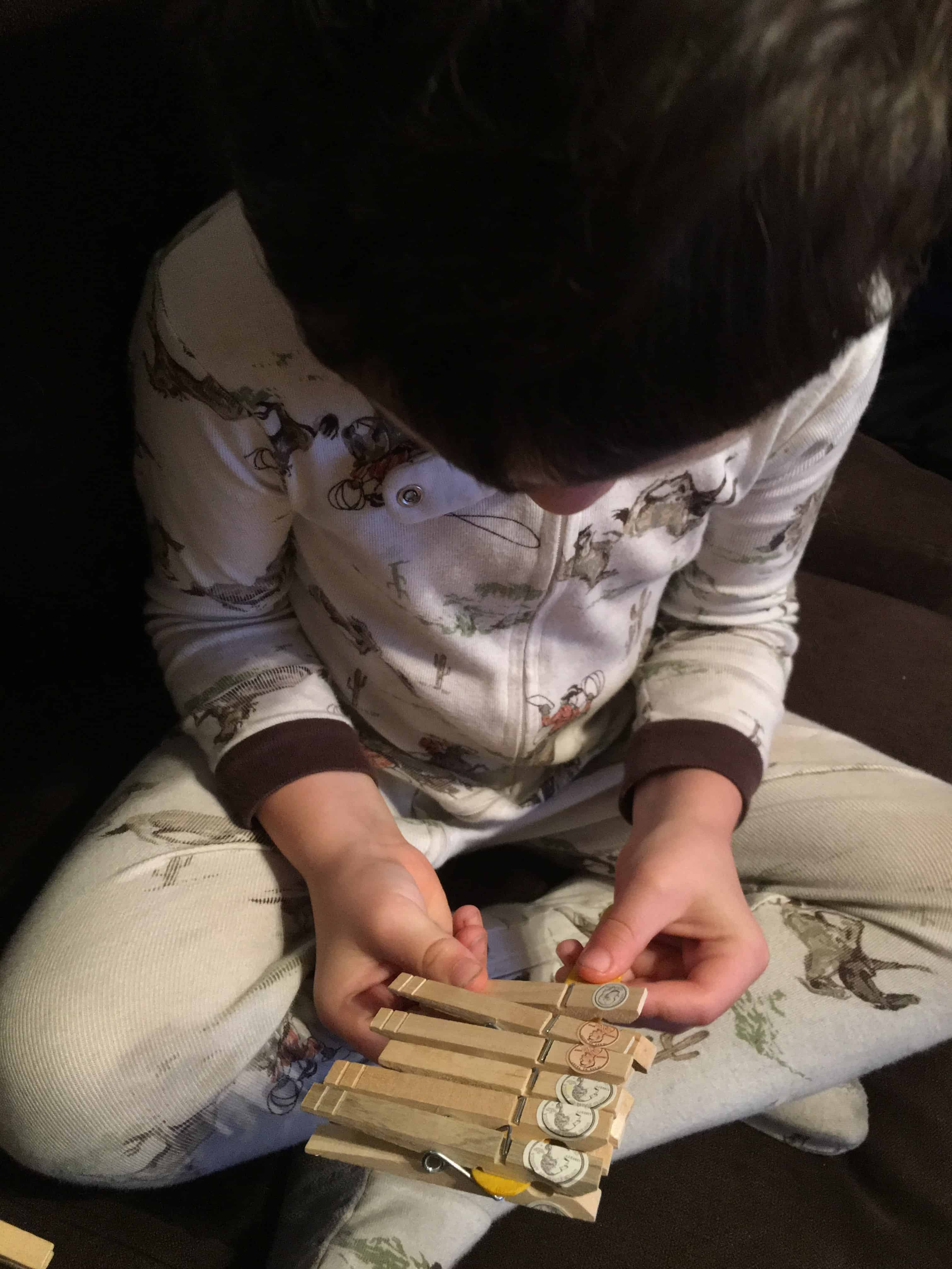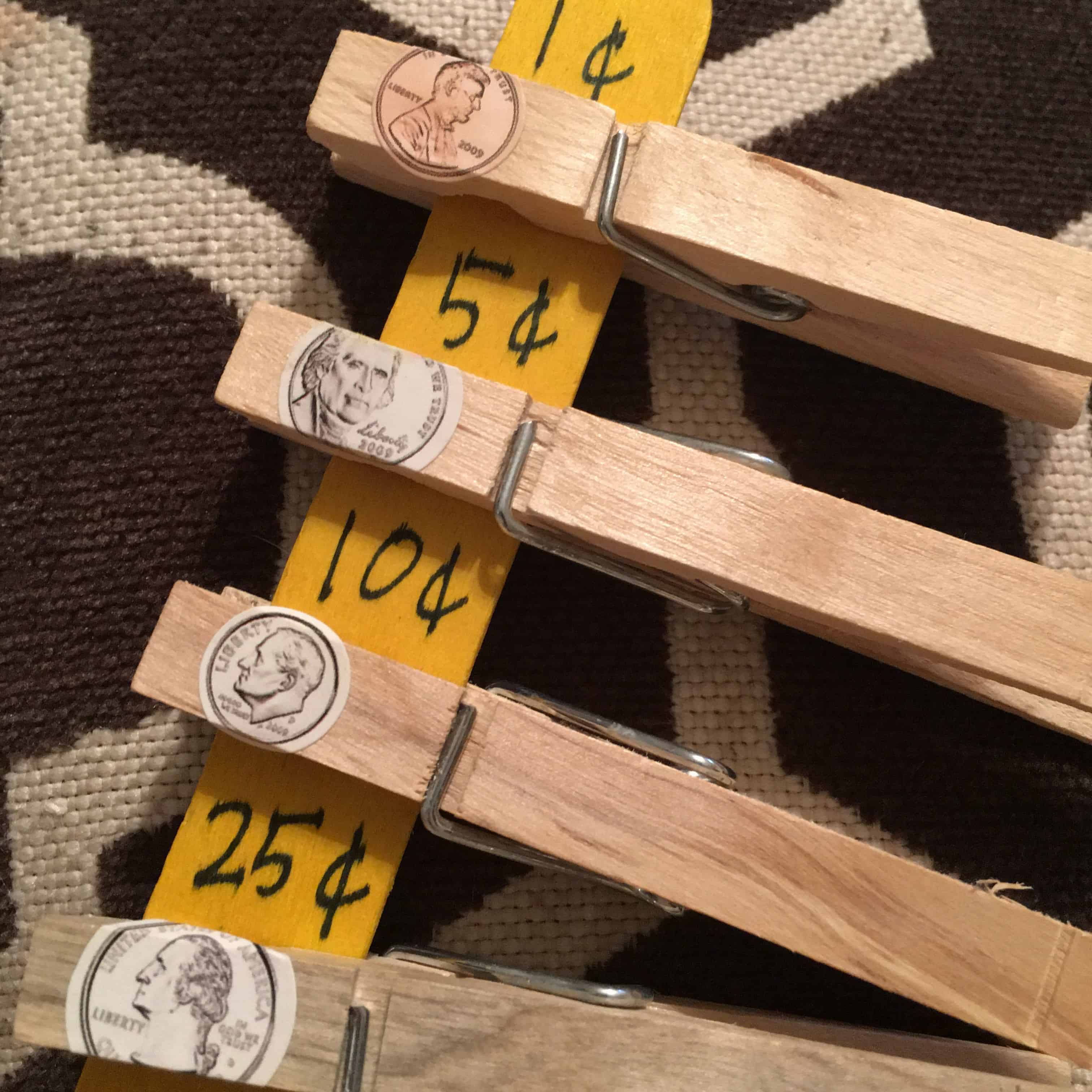 Make one stick with the different coin values on it to first practice the values of each coin.