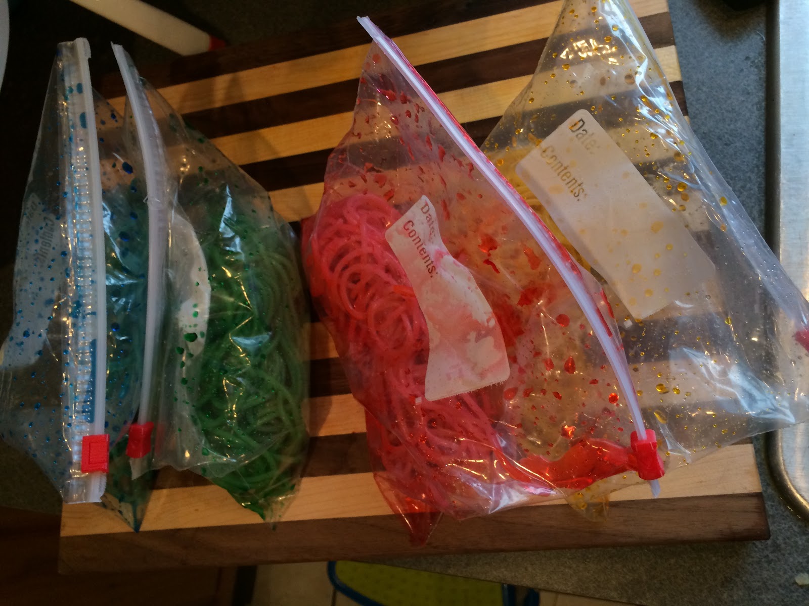 We then prepared our plastic bags for coloring the pasta. We chose four different colors, pink, green, yellow and blue. You simply put a few few drops of food coloring in a bag with a couple tablespoons of water then add the cooked pasta.