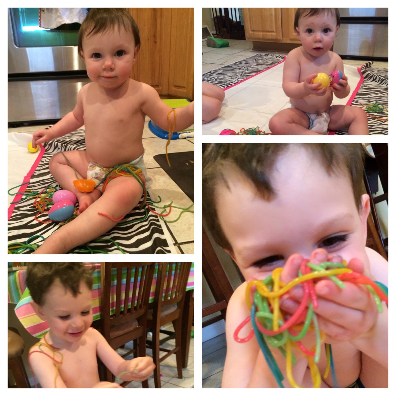 I added our treasure-filled eggs to the pasta and placed it all in the middle of a plastic tablecloth taped to our kitchen floor and stripped my kids down to their diaper and underwear! This allowed them to have the space to play and make a mess while really exploring the texture, color and taste of the pasta!