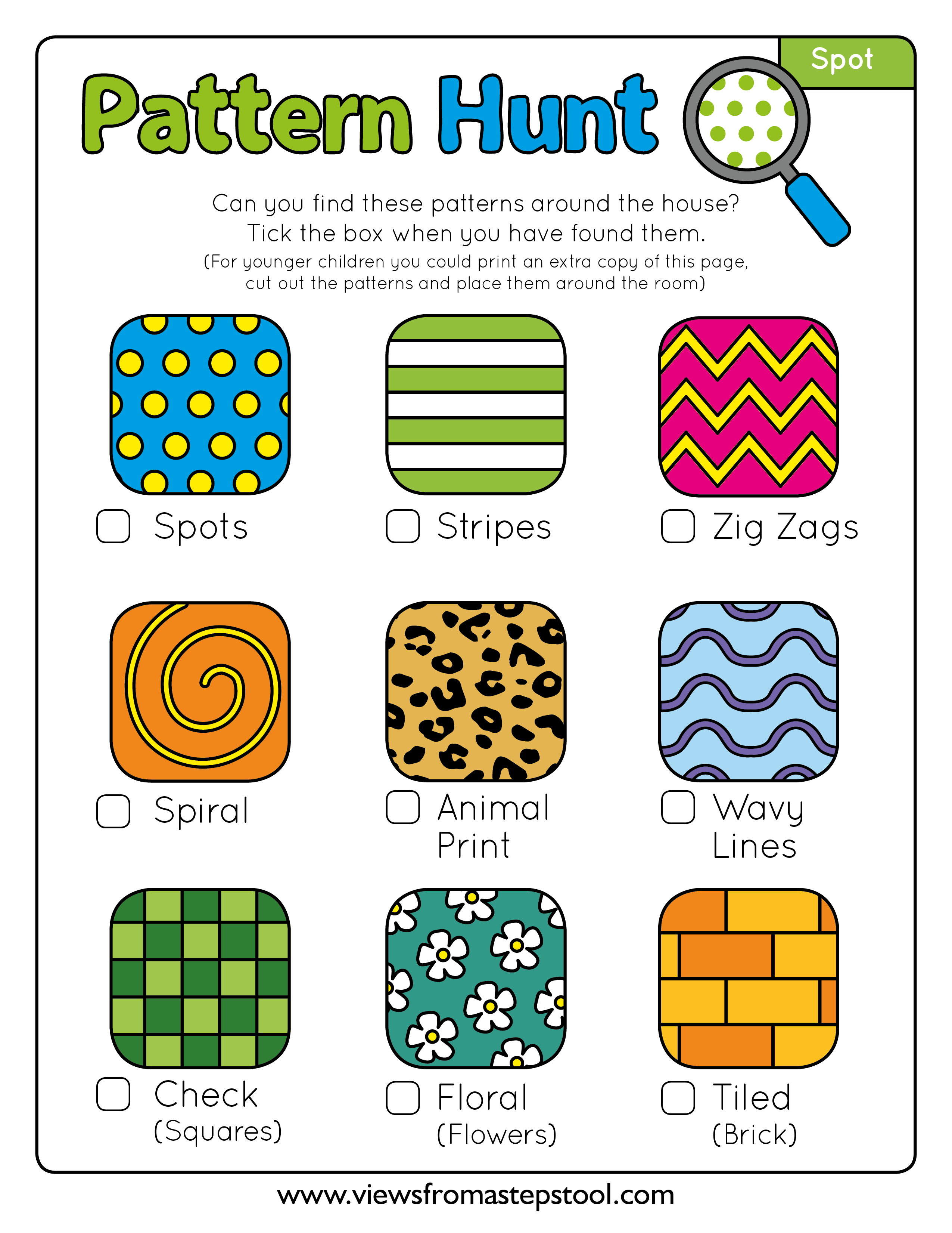 Basically just print off the forms and let them go! They’ll have to keep their eyes peeled for new patterns that maybe haven’t caught their eyes before. Also tell them to be certain to draw or right now new patterns that aren’t on their list, too.