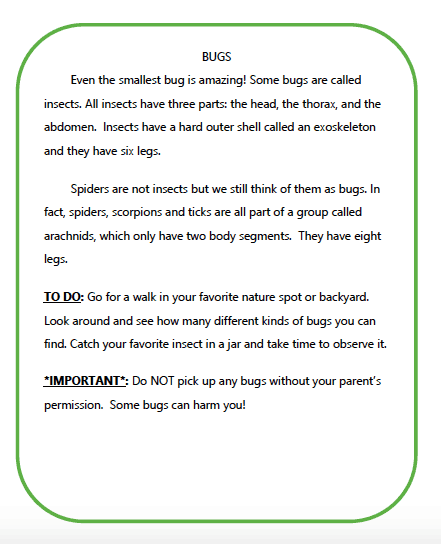 We love looking for bugs under old logs or pieces of bark, looking for frogs in streams, and chasing butterflies around open fields. I realize that this might not be for everyone, so it’s perfectly find to study your bug from a distance! (or even online :))